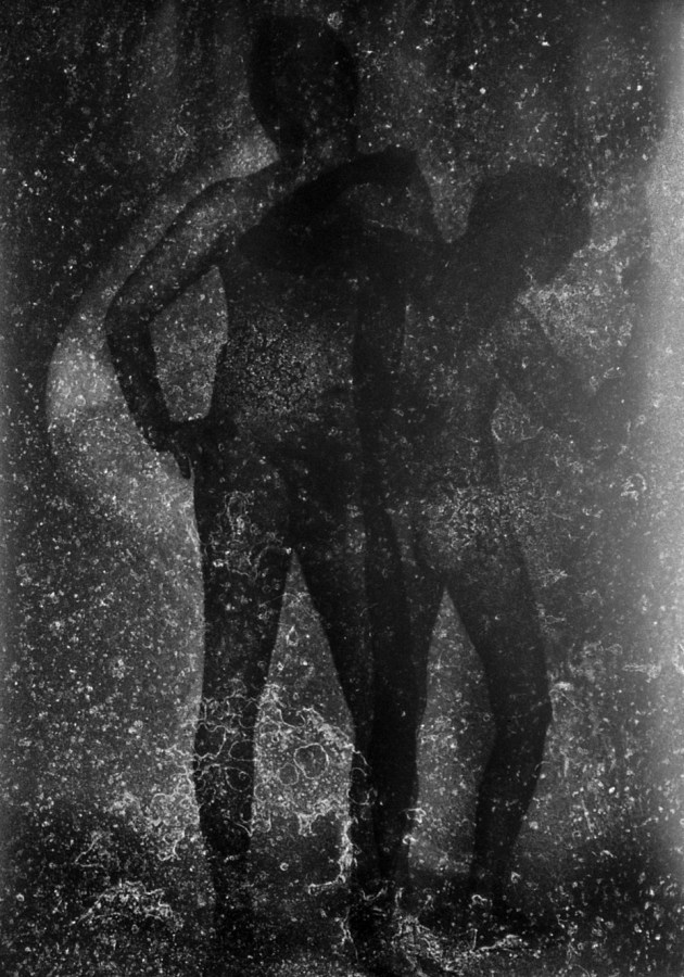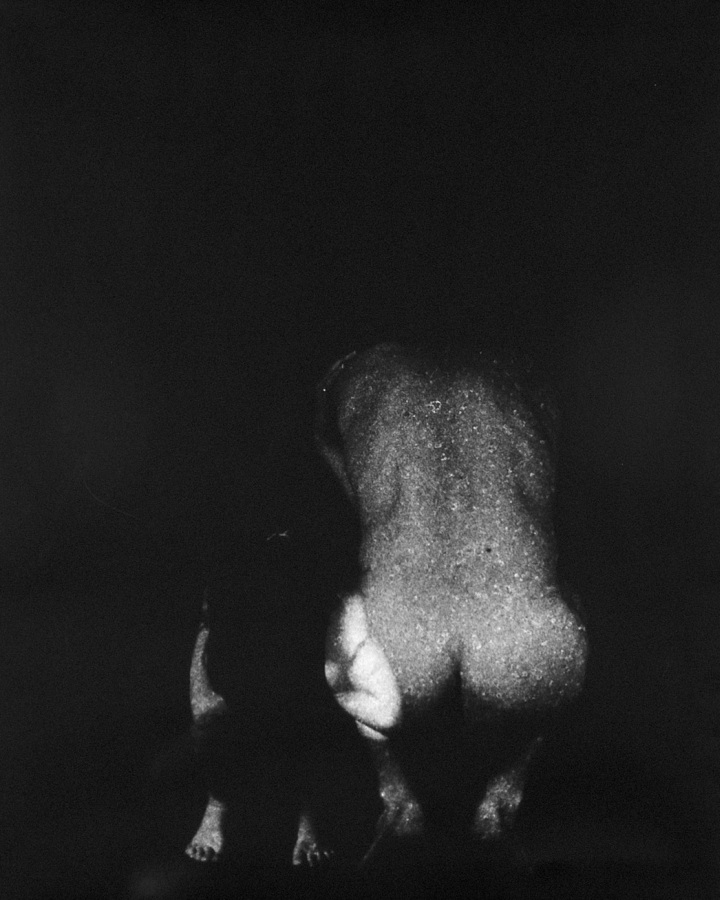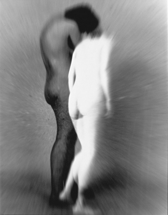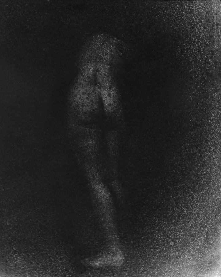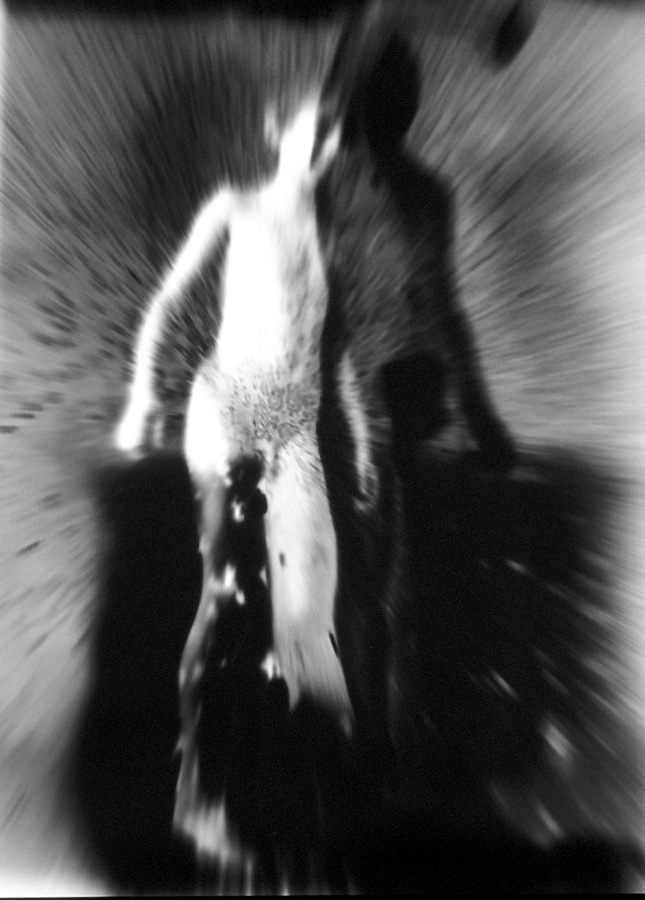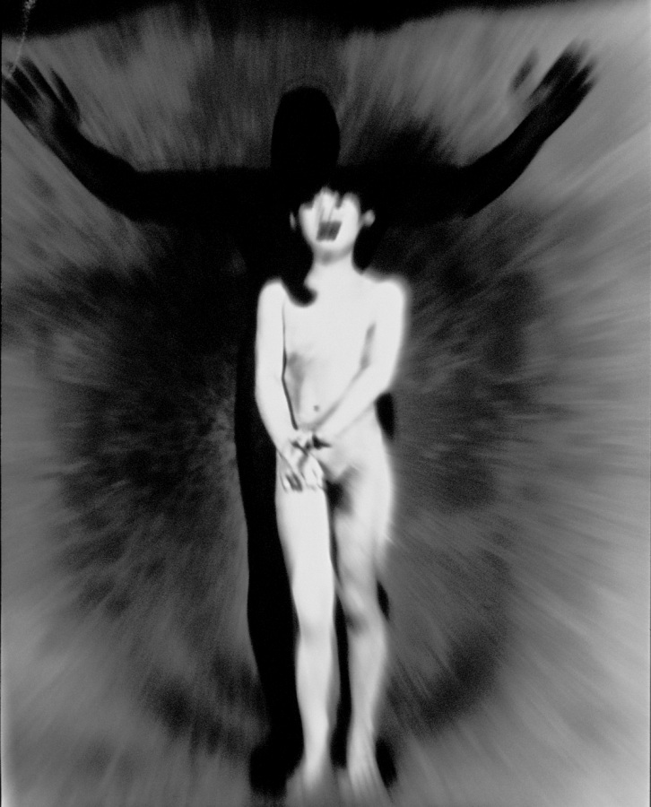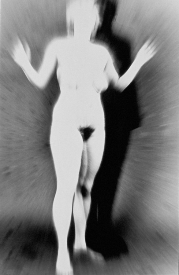 An der Universitaet fuer angewandte Kunst in Wien hoerten wir am 26. April 1986 ueber Radio von der Katastrophe im Kernkraftwerk von Tschernobyl. Zur selben Stunde waren meine Studenten bereit, Angst und Schrecken – nackt zu zeigen. Eine Studentin eilte heim um auch ihre beiden Kinder in das Projekt einzubinden. Um das Strahlen zu symbolisieren habe ich in die Ausarbeitung der klassischen Hasselblad-Negative vorsaetzlich auf vielfaeltige Weise manipulativ eingegriffen. Die letzten Bilder des Zyklus (teilweise von Bakterien zerstoert), vermitteln Veraschung und Versteinerung.