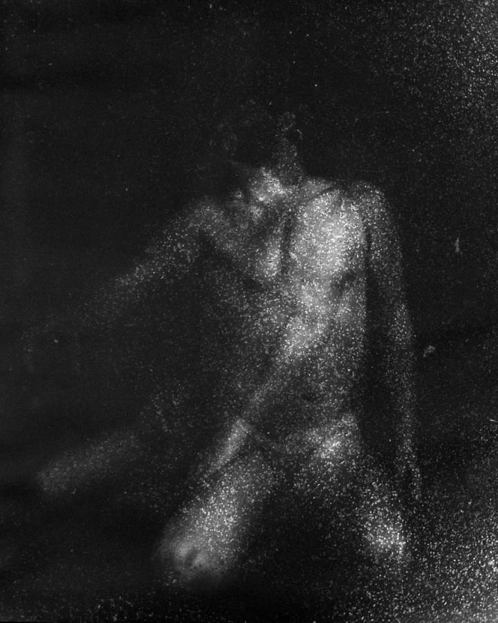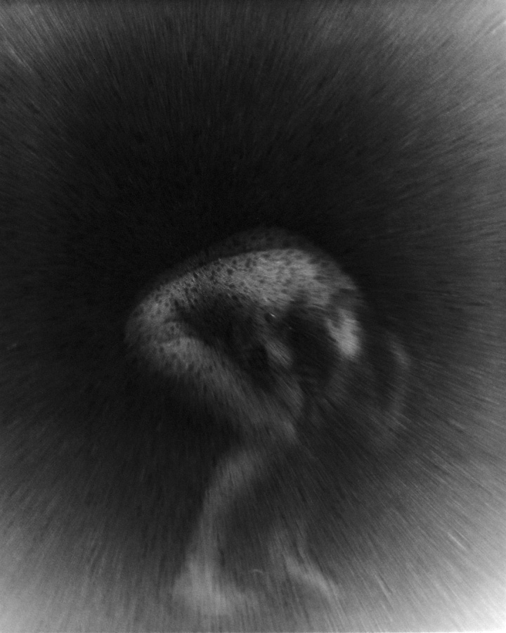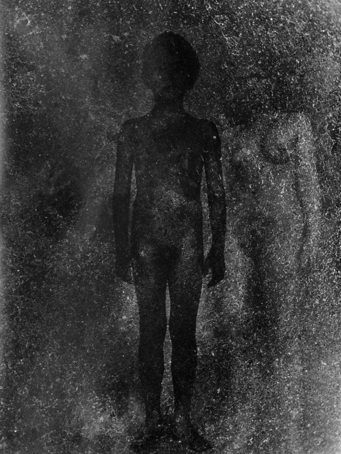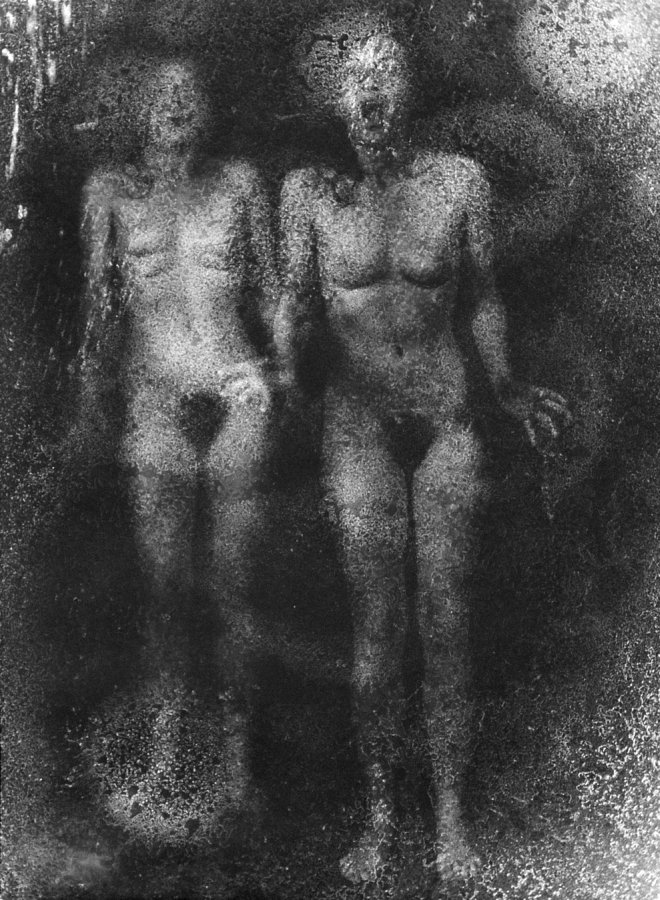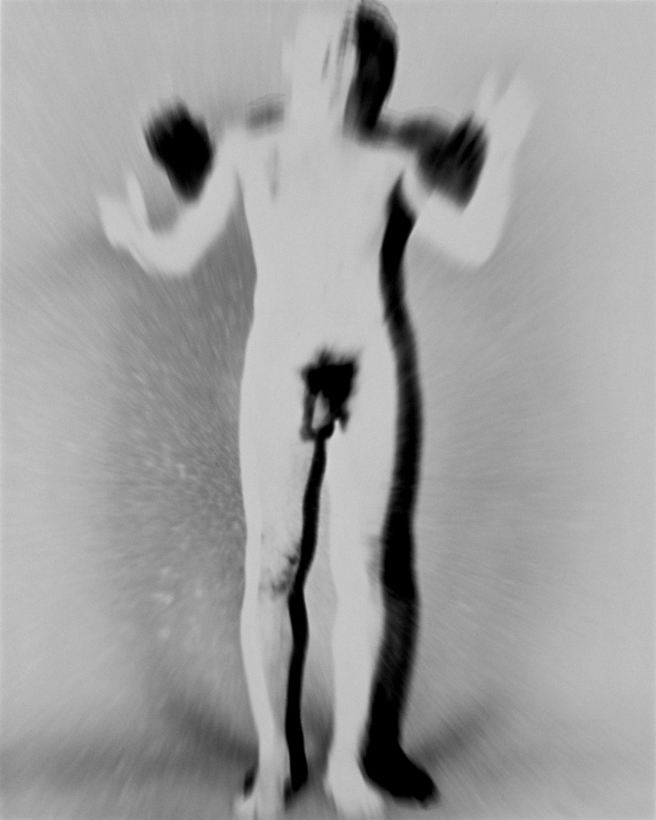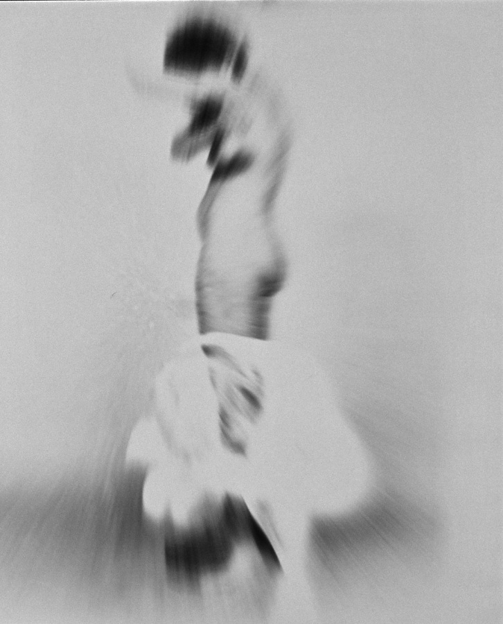 An der Universitaet fuer angewandte Kunst in Wien hoerten wir am 26. April 1986 ueber Radio von der Katastrophe im Kernkraftwerk von Tschernobyl. Zur selben Stunde waren meine Studenten bereit, Angst und Schrecken – nackt zu zeigen. Eine Studentin eilte heim um auch ihre beiden Kinder in das Projekt einzubinden. Um das Strahlen zu symbolisieren habe ich in die Ausarbeitung der klassischen Hasselblad-Negative vorsaetzlich auf vielfaeltige Weise manipulativ eingegriffen. Die letzten Bilder des Zyklus (teilweise von Bakterien zerstoert), vermitteln Veraschung und Versteinerung.