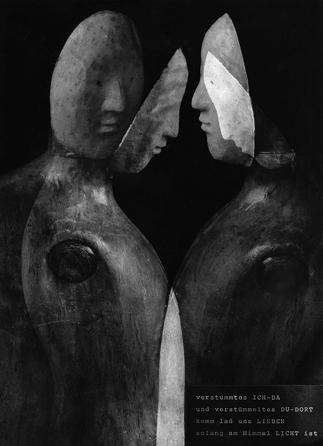 Text im Titelbild von Zyklus Nr. 1: Verstummtes Ich-Da und verstuemmeltes Du-Dort komm lass uns lieben solang am Himmel Licht ist.