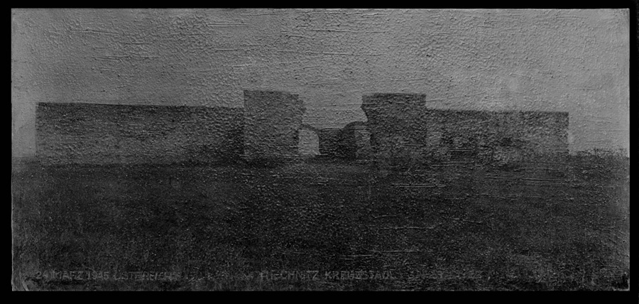 In der Nacht zum Palmsonntag 1945 (in den letzten Tagen des Zweite Weltkriegs) wurden 180 Menschen, meist ungarische Juden, aus einem abgestellten Viehwagon getrieben und beim Kreuzstadel in Rechnitz ermordet. Bauern die gezwungen waren eine Grube auszuheben, wurden ebenfalls exekutiert. In Oesterreich hat es 50 Jahre gebraucht, um Erinnern zuzulassen. Erst 1995 wurde, um eine Gedenkstaette vorzubereiten, der Ist-Zustand der Ruine des Kreuzstadels konserviert. Ich fotografierte die Ruine und nahm einen Kuebel Erde vom Ort mit. Im Studio fixierte ich die Erde auf Leinen und machte sie fotosensibel. Darauf belichtete ich die Aufnahme von der Ruine und die Textzeile: