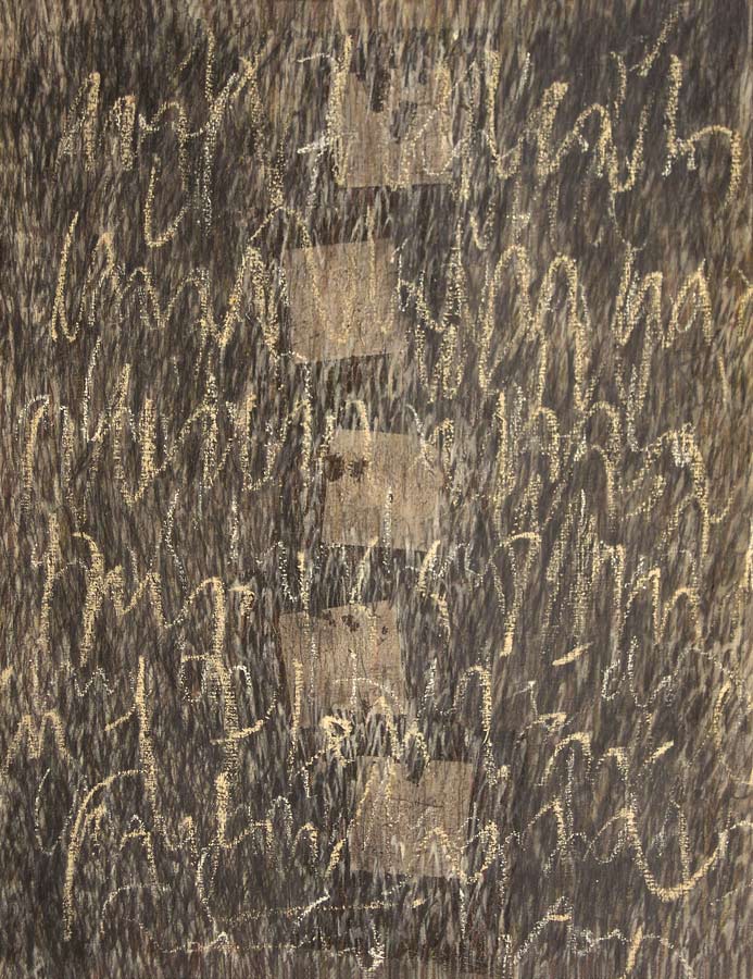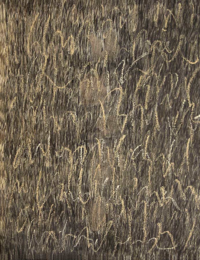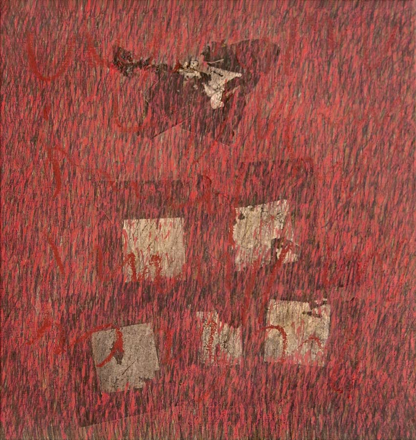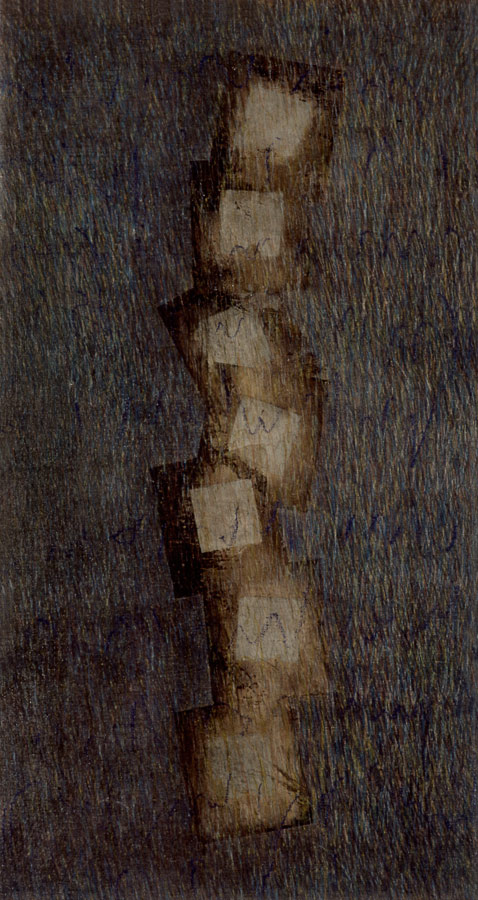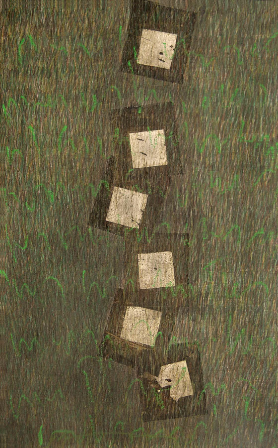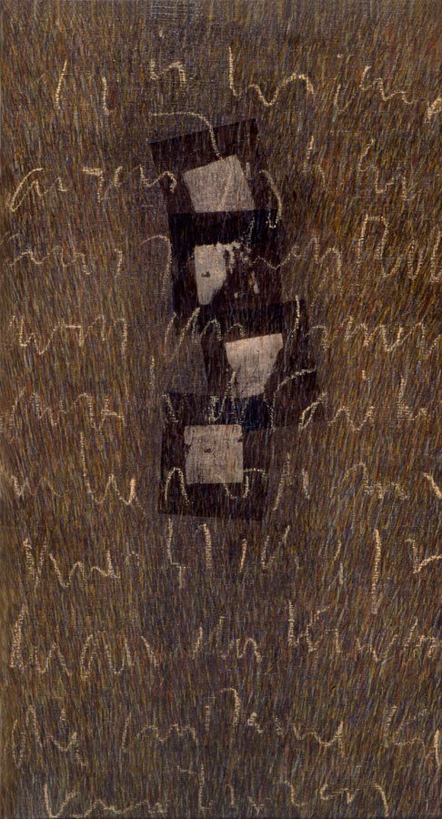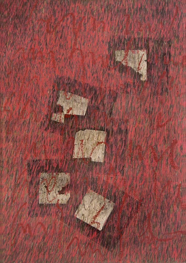 Das Werk und die persoenliche Geschichte der Dichterin Christine Lavant (Oesterreich 1915-1973) erwecken Bewunderung, Respekt und Mitgefuehl. 1998 entstanden Skizzen, 1999 widmete ich den vorliegenden Zyklus ihrem Prosa-Werk. In die Grundierung kollagierte ich chinesisches Zeremonien-Geld und ueberschrieb in vielen Schriftschichten die Formate mit dem Text ihres Romanes „Das Wechselbaelgchen“.