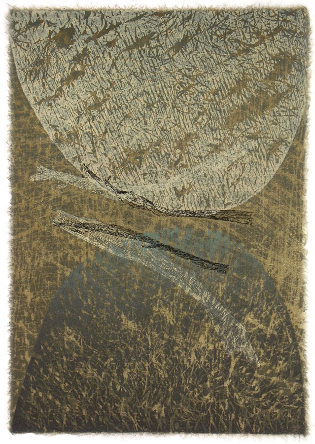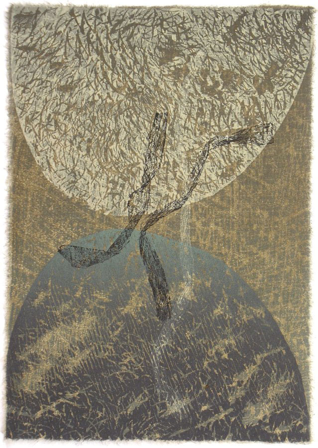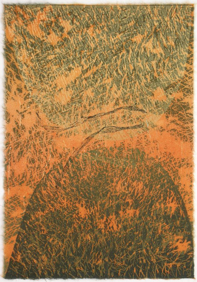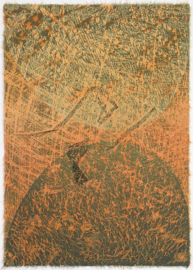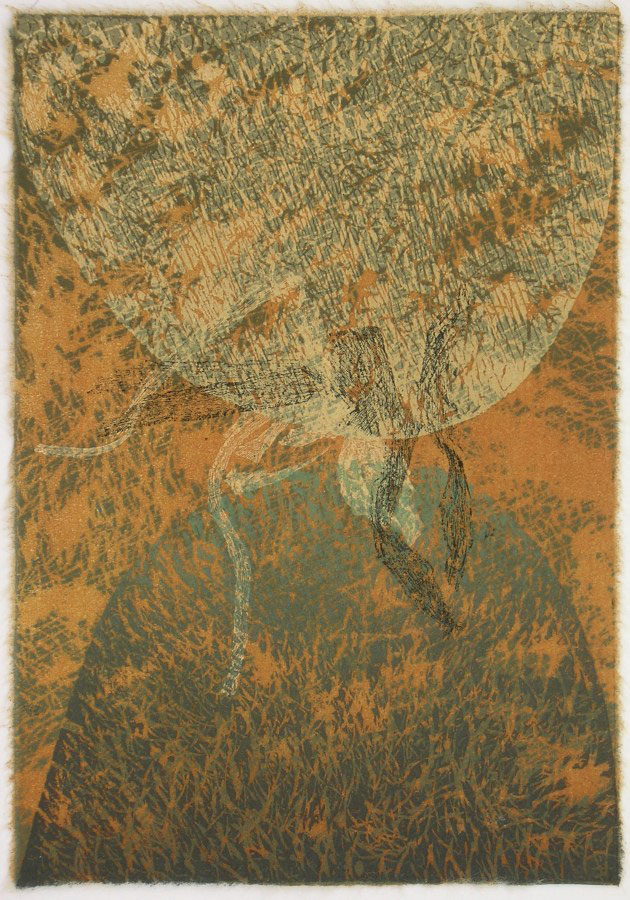 Die Gedichte im Band “Proverbios” von Ramon Llull (Mallorca 1232 – 1316) beruehrten und inspirierten mich. Als ob der Beitrag des Lyrikers Ramon Llull zum Bild vom christlichen Theologen, Philosophen, Wissenschaftler und Logiker Ramon Llull etwas Wichtiges beizutragen haette; als ob es der Lyrik vorbehalten wäre, die Moeglichkeit einer Versoehnung von Himmel und Hoelle anzudeuten. Ich entschloss mich, einander spiegelnde, sich beinahe beruehrende Bergformen mit verschieden strukturierten Linolschnitten darzustellen; als unverbindlich – Verbindendes brachte ich mittels Transferdruck die natuerliche Gestik getrockneter Strandlilienblaetter ein. Die Farbpalette zeigt die Tonalitaeten von Erde, Vegetation, Himmel und Wolken Mallorcas.