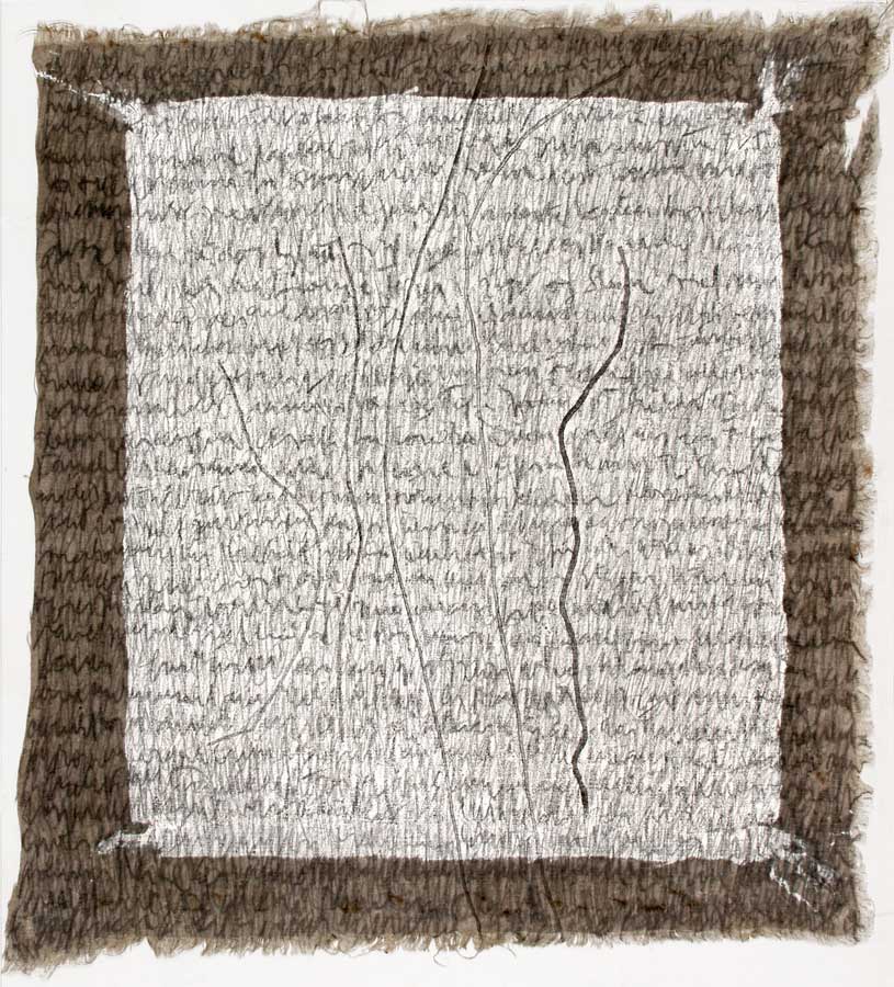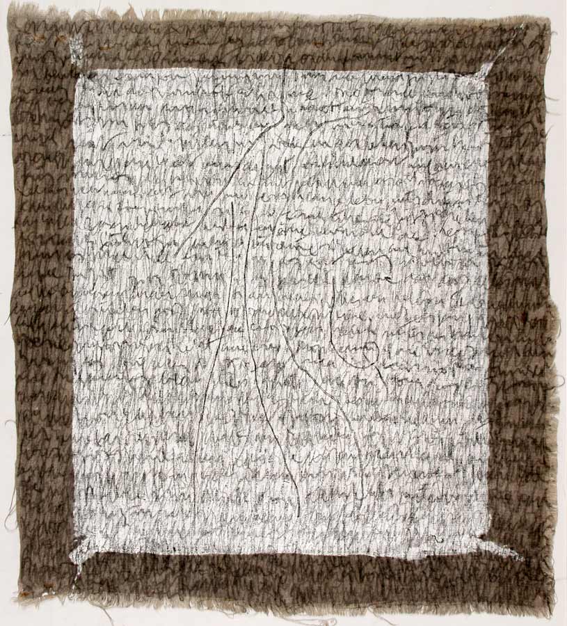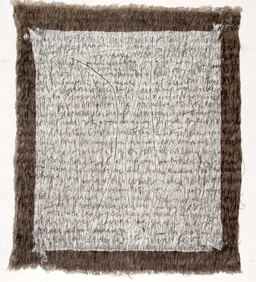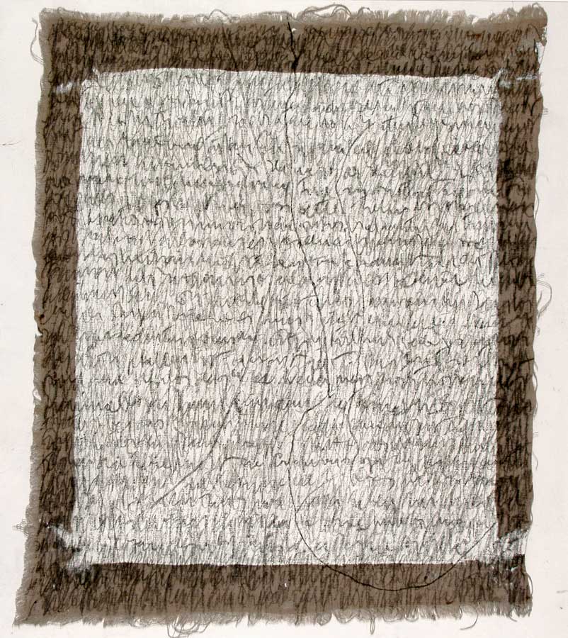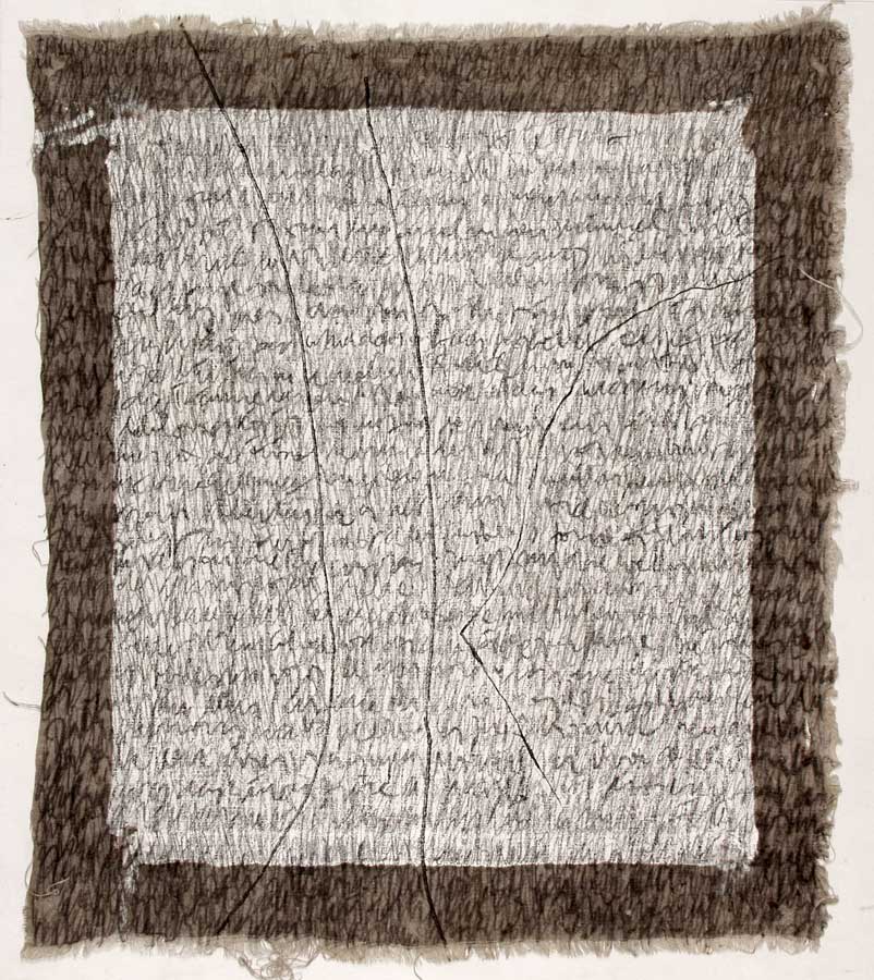 Kurz entschlossen loeste ich die Leinwaende von den Keilrahmen und nun das ganze Format nutzend, ueberarbeitete ich das Vorhandene in sieben weiteren Schreibschichten mit Graphitstiften. Im meditativen Vorgehen verdichtete ich das skripturale Netzwerk Schicht ueber Schicht. Die ersten Aufschreibungen verschwanden optisch, aber die Praesenz der Wurzelabdruecke in ihrer starken Gestik ist erhalten geblieben und ist eine wichtige Metapher in meiner Hommage an die Dichterin. Wislawa Szymborska.