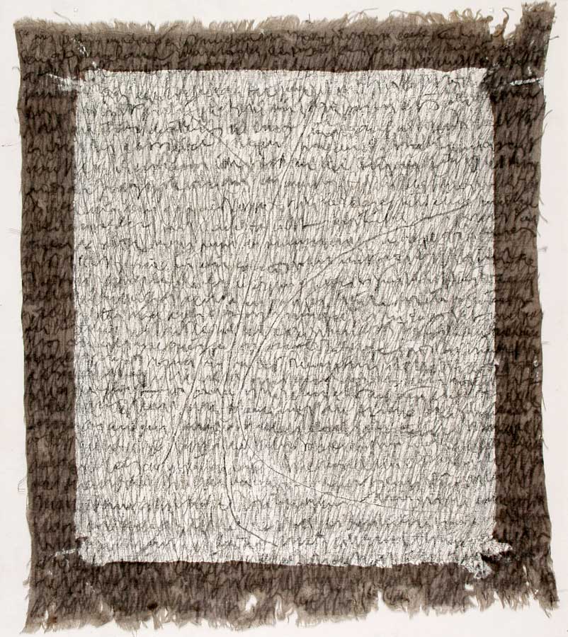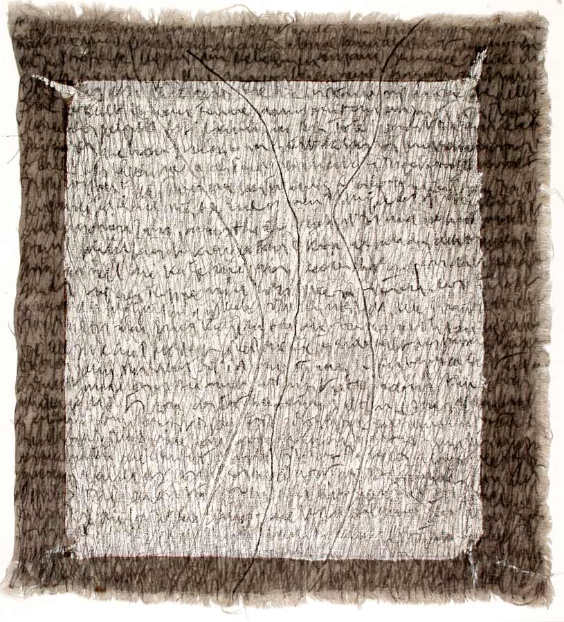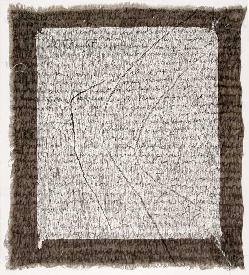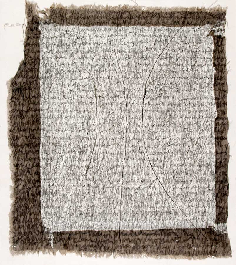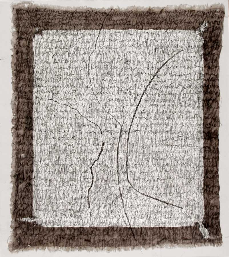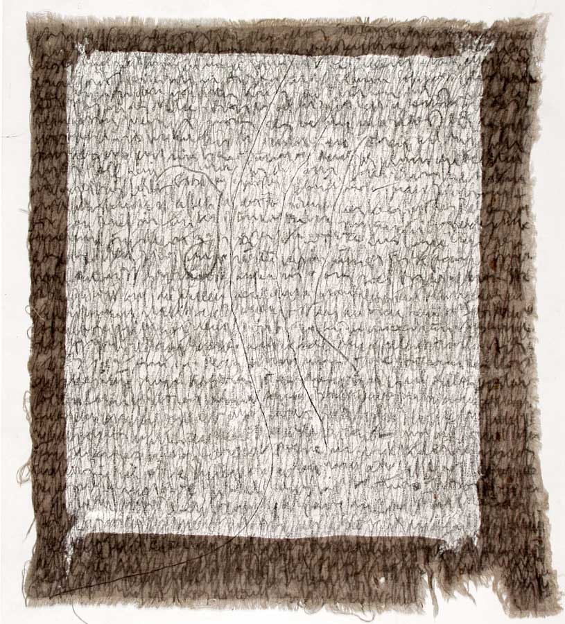 Kurz entschlossen loeste ich die Leinwaende von den Keilrahmen und nun das ganze Format nutzend, ueberarbeitete ich das Vorhandene in sieben weiteren Schreibschichten mit Graphitstiften. Im meditativen Vorgehen verdichtete ich das skripturale Netzwerk Schicht ueber Schicht. Die ersten Aufschreibungen verschwanden optisch, aber die Praesenz der Wurzelabdruecke in ihrer starken Gestik ist erhalten geblieben und ist eine wichtige Metapher in meiner Hommage an die Dichterin. Wislawa Szymborska.