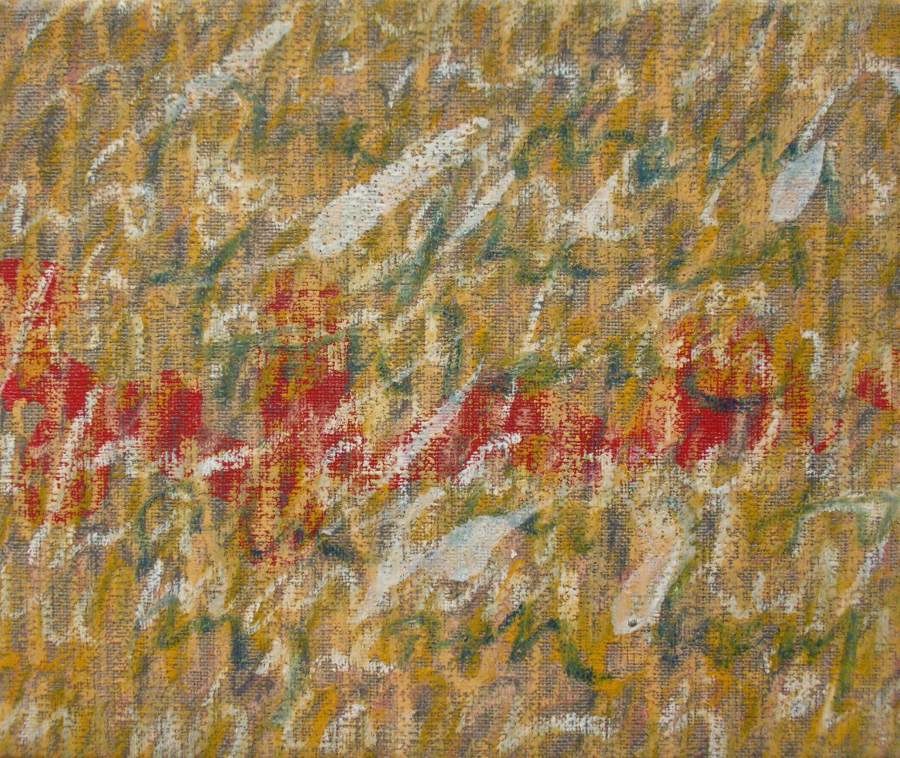 Die siebzig kleinen Formate (der Umfang jedes Bildchens misst 70 cm), bilden eine Installation. Zusammengehalten wird sie – mehr oder weniger sichtbar – von der durchgaengigen Spur des Lebens und der Liebe, die unter den Schreibschichten liegt. Ob krumm, ob gerade, weiter und weiter ziehe ich sie…