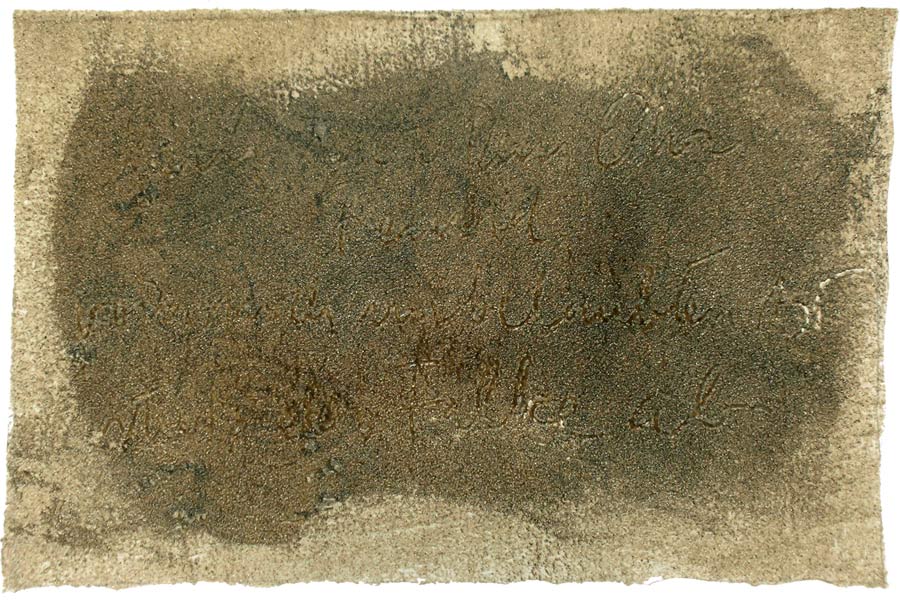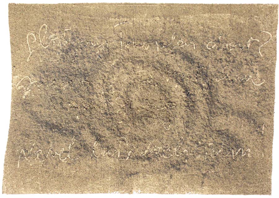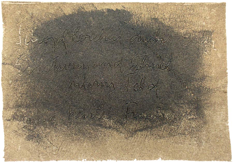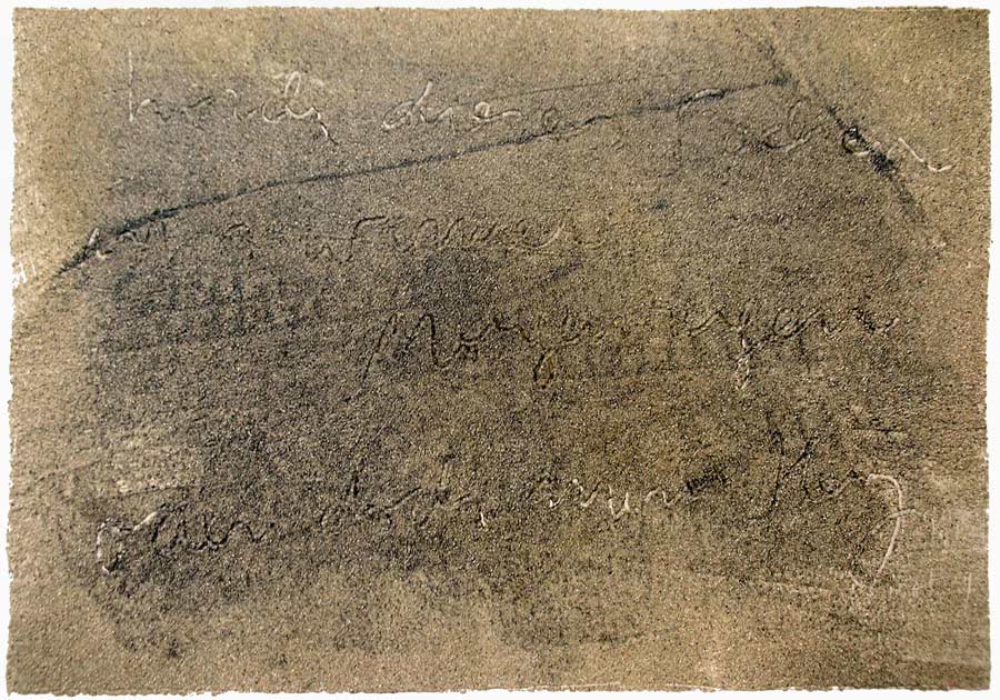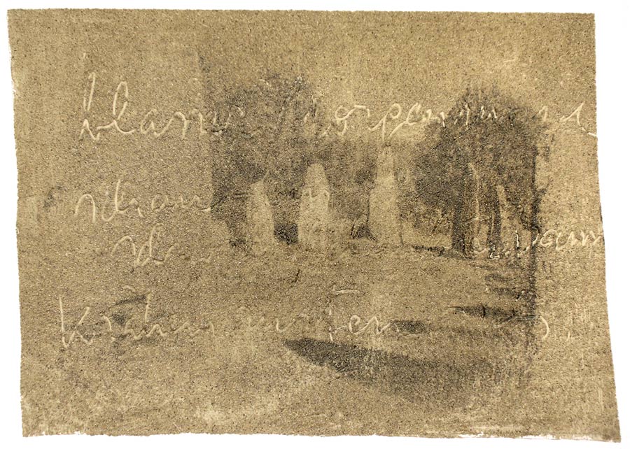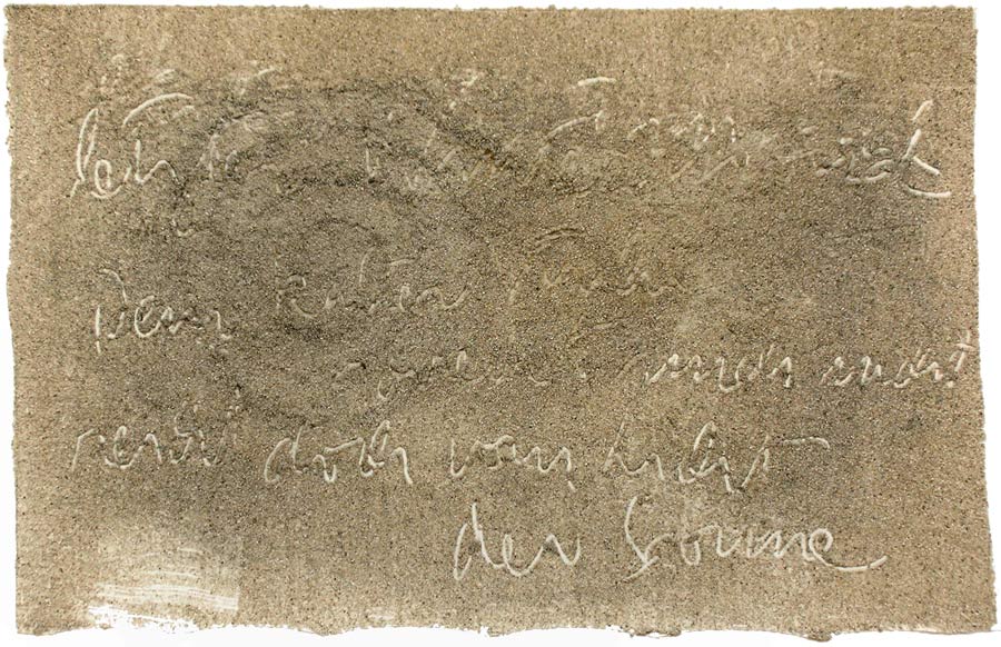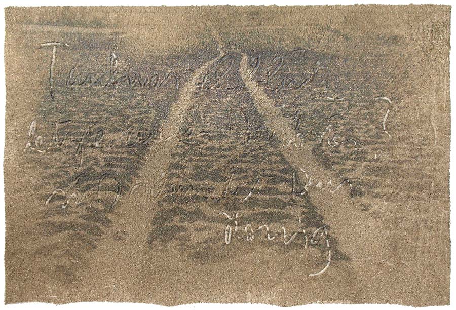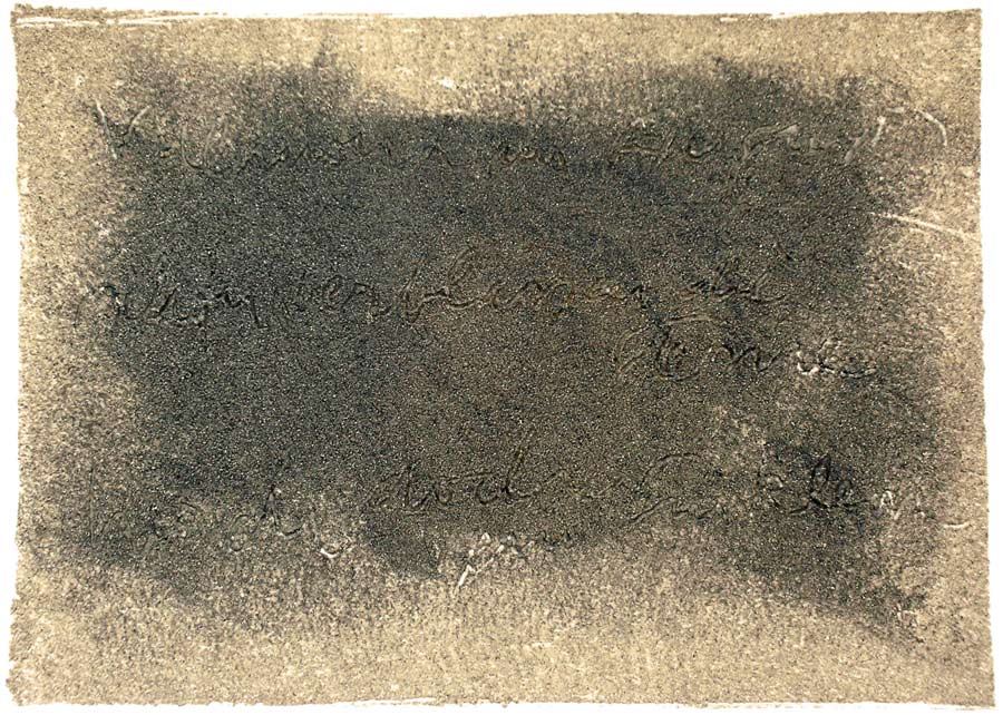 Ich grundierte 19 Leinenteile aus Polen mit Sanden aus Schweden, Oesterreich und Mallorca. In den nassen Sand schrieb ich meine Haiku-Gedichte. Um festzuhalten „was Wind und Wasser forttragen würden“, machte ich die Oberflaechen photosensibel. Nicht um zu illustrieren projizierte ich Photos von vorchristlichen Petroglyphen, Stelen (in skandinavischen Waeldern aufgenommen), von Ufer-Kiesel, von unbekannten Wegen, auf die Gedichte. Es ging um das freie Assoziieren, um das Ueberbruecken von Kulturen und Zeiten.