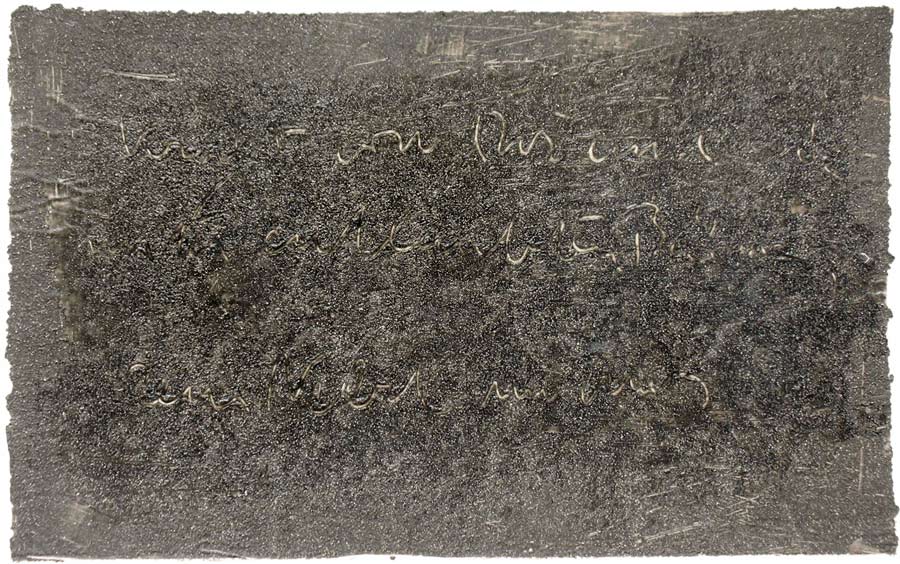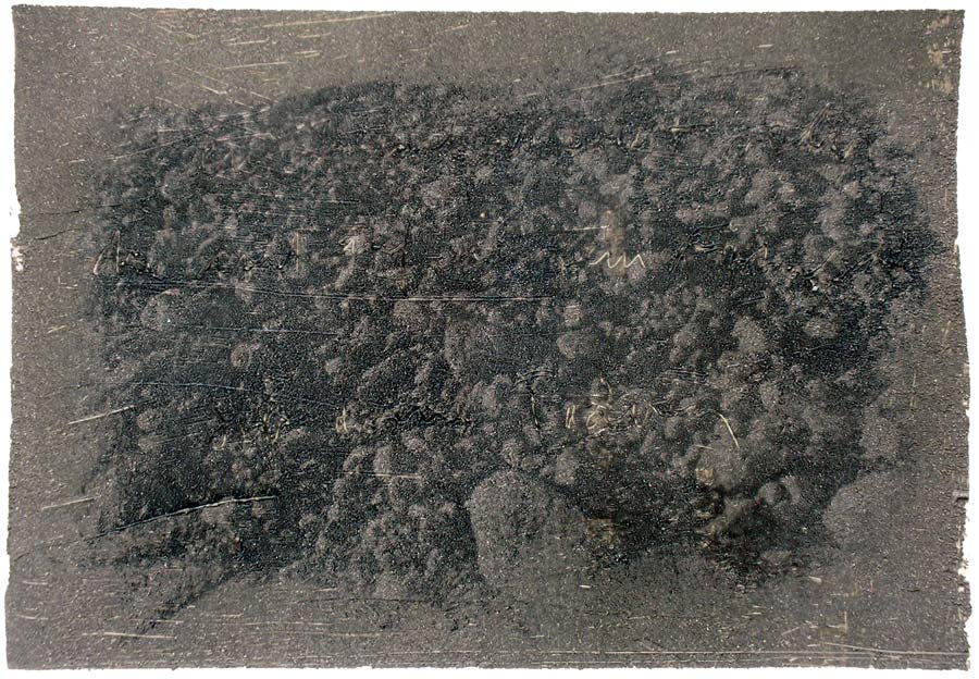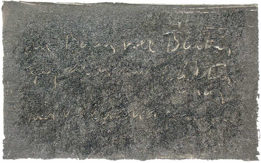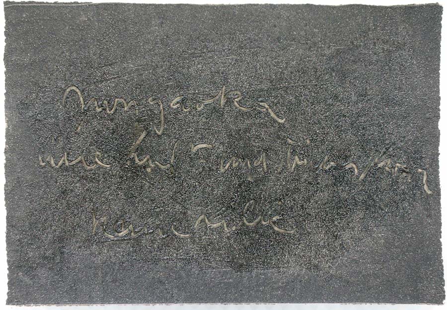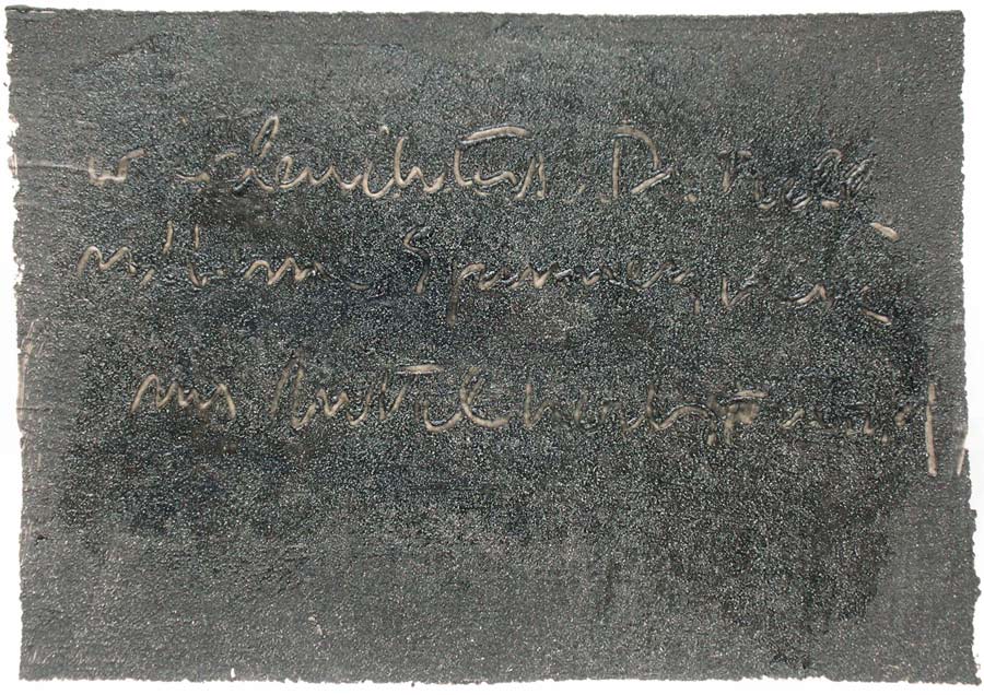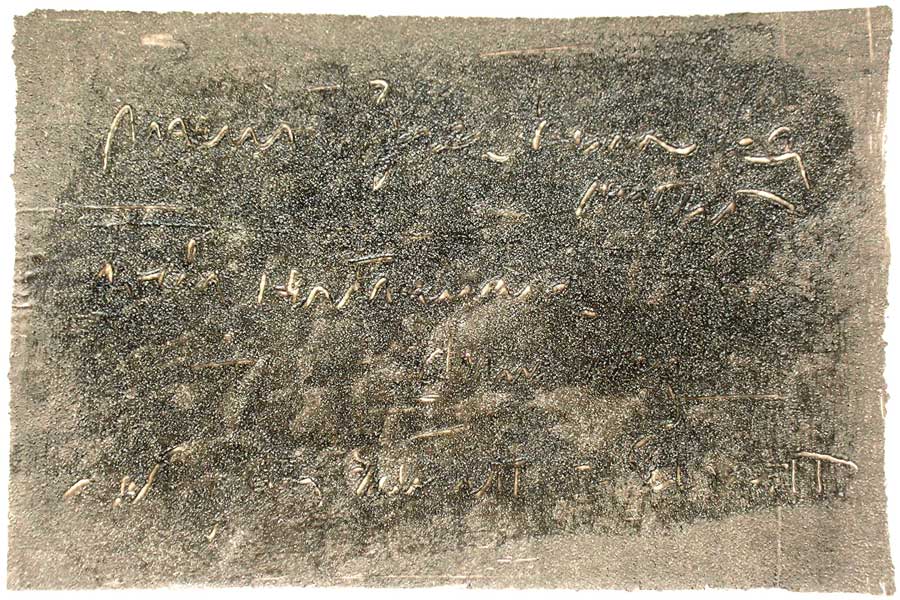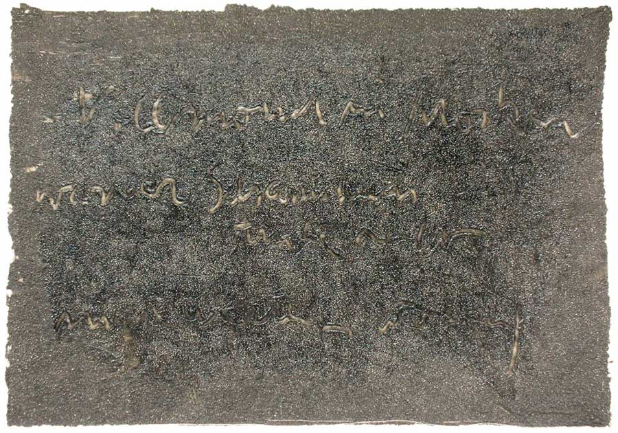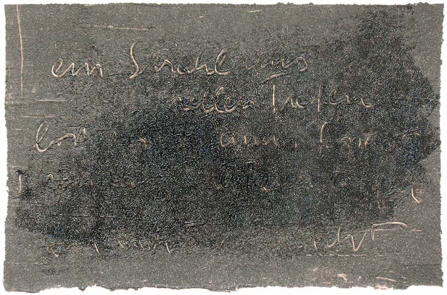 Ich grundierte 19 Leinenteile aus Polen mit Sanden aus Schweden, Oesterreich und Mallorca. In den nassen Sand schrieb ich meine Haiku-Gedichte. Um festzuhalten „was Wind und Wasser forttragen würden“, machte ich die Oberflaechen photosensibel. Nicht um zu illustrieren projizierte ich Photos von vorchristlichen Petroglyphen, Stelen (in skandinavischen Waeldern aufgenommen), von Ufer-Kiesel, von unbekannten Wegen, auf die Gedichte. Es ging um das freie Assoziieren, um das Ueberbruecken von Kulturen und Zeiten.